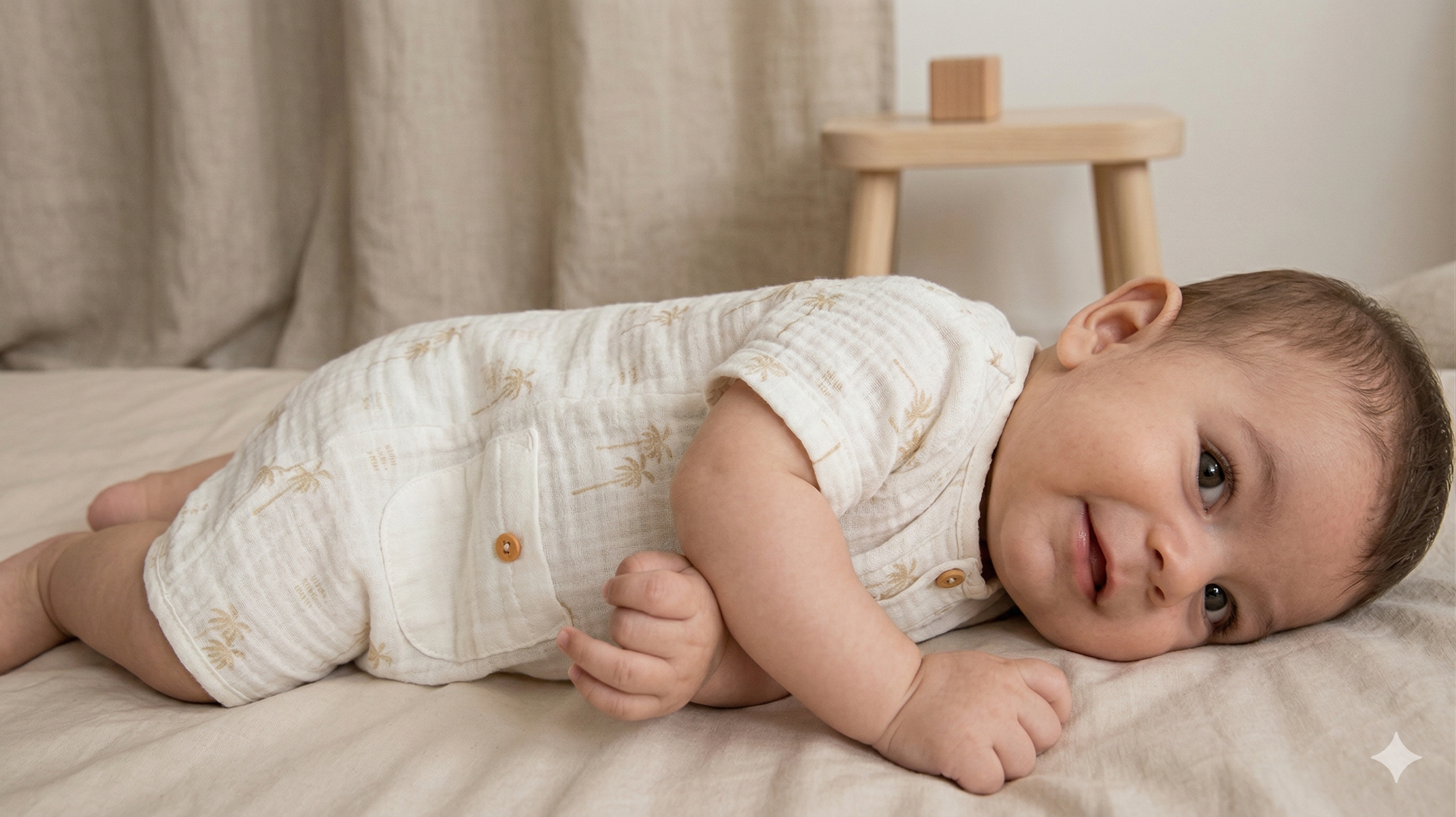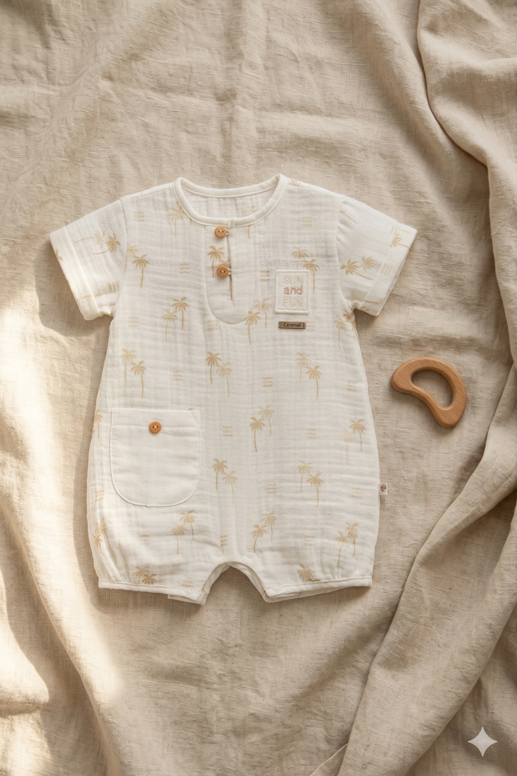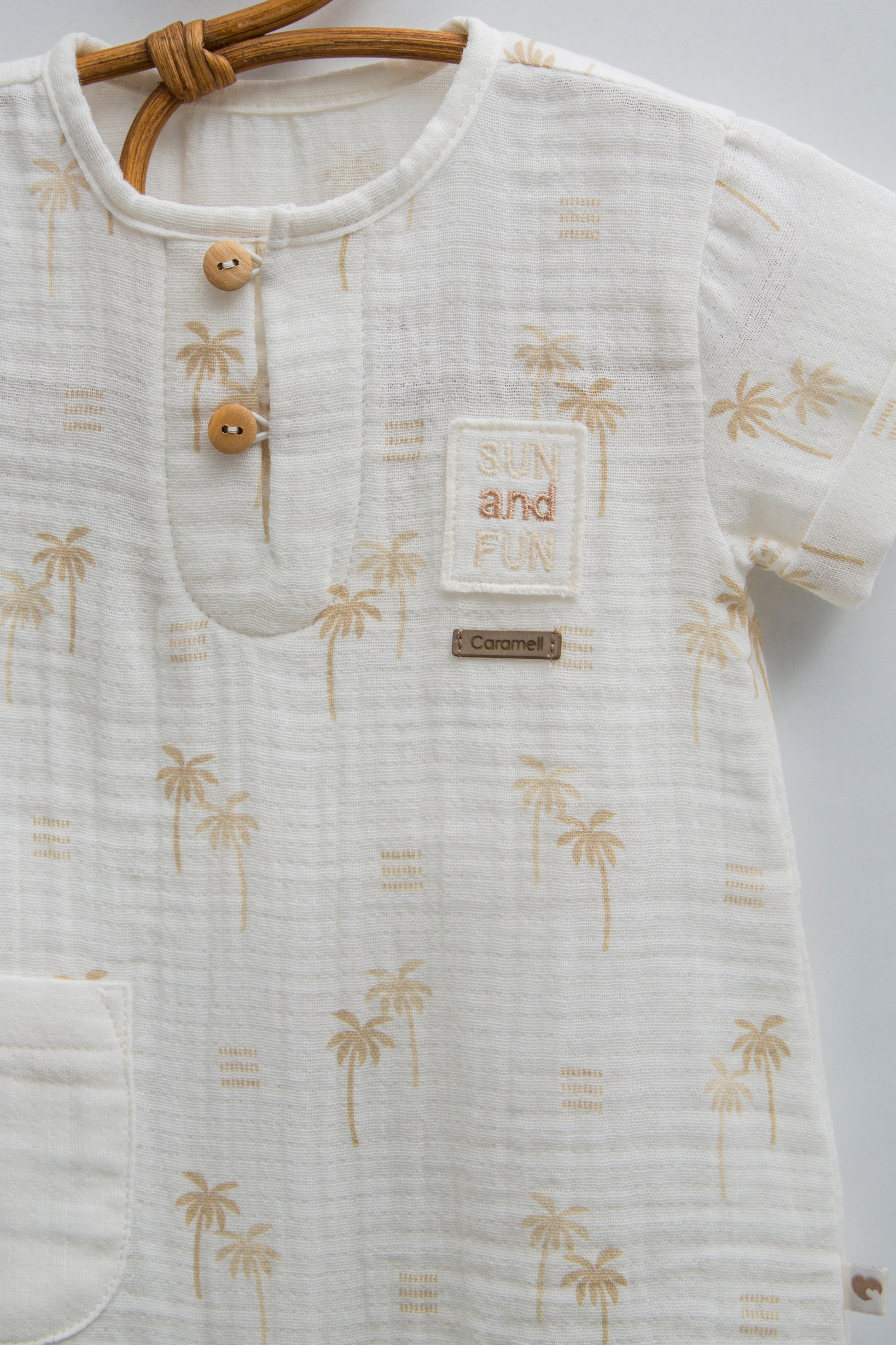 Müslin pamuk kumaşıyla üretilen bu bebek tulumu, yaz aylarında bebeğinizin rahat etmesi için tasarlanmıştır.