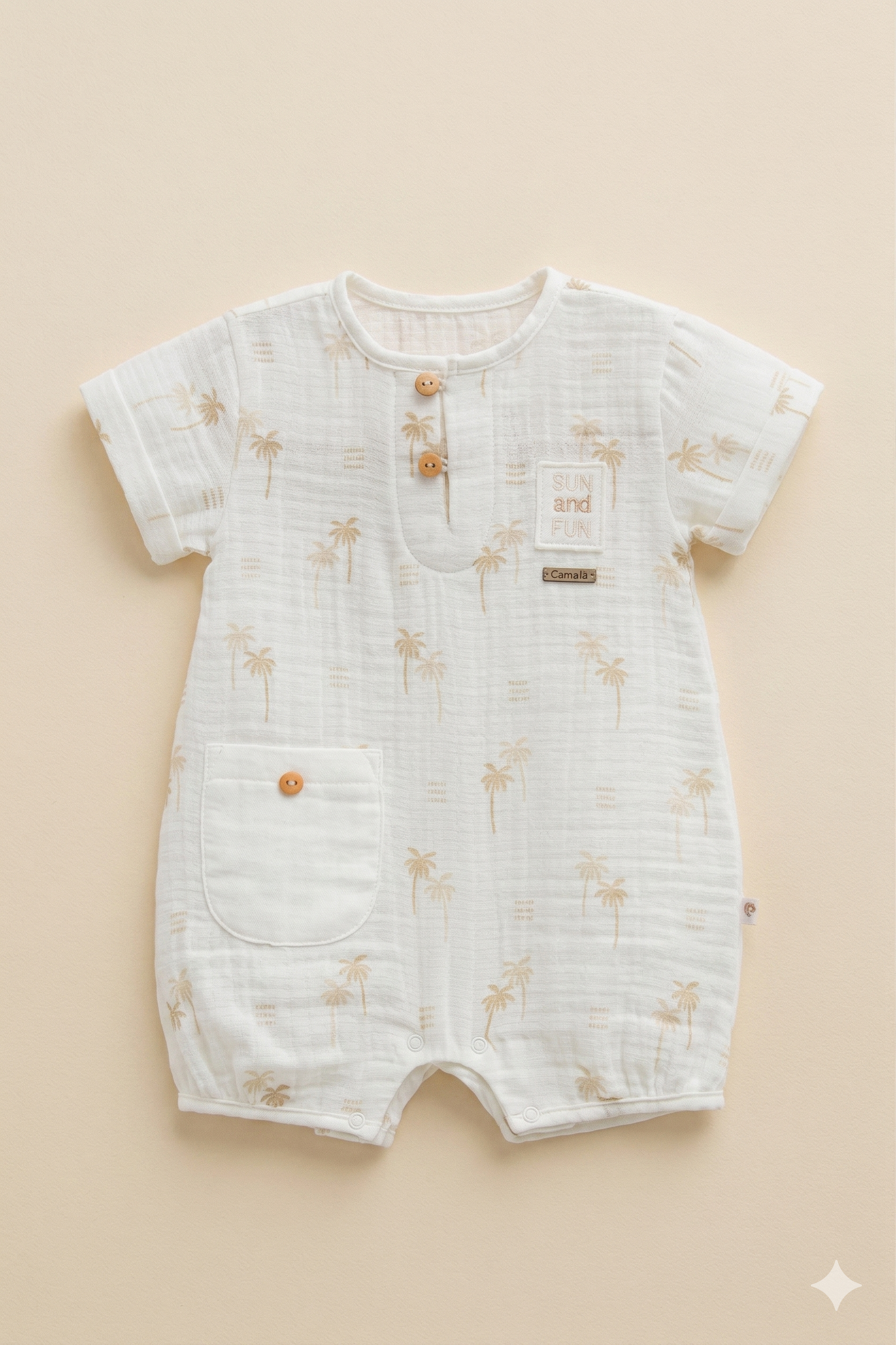 Desenli Müslin Pamuk Bebek Tulum - Yazlık Kısa Kollu Romper (Ekru)